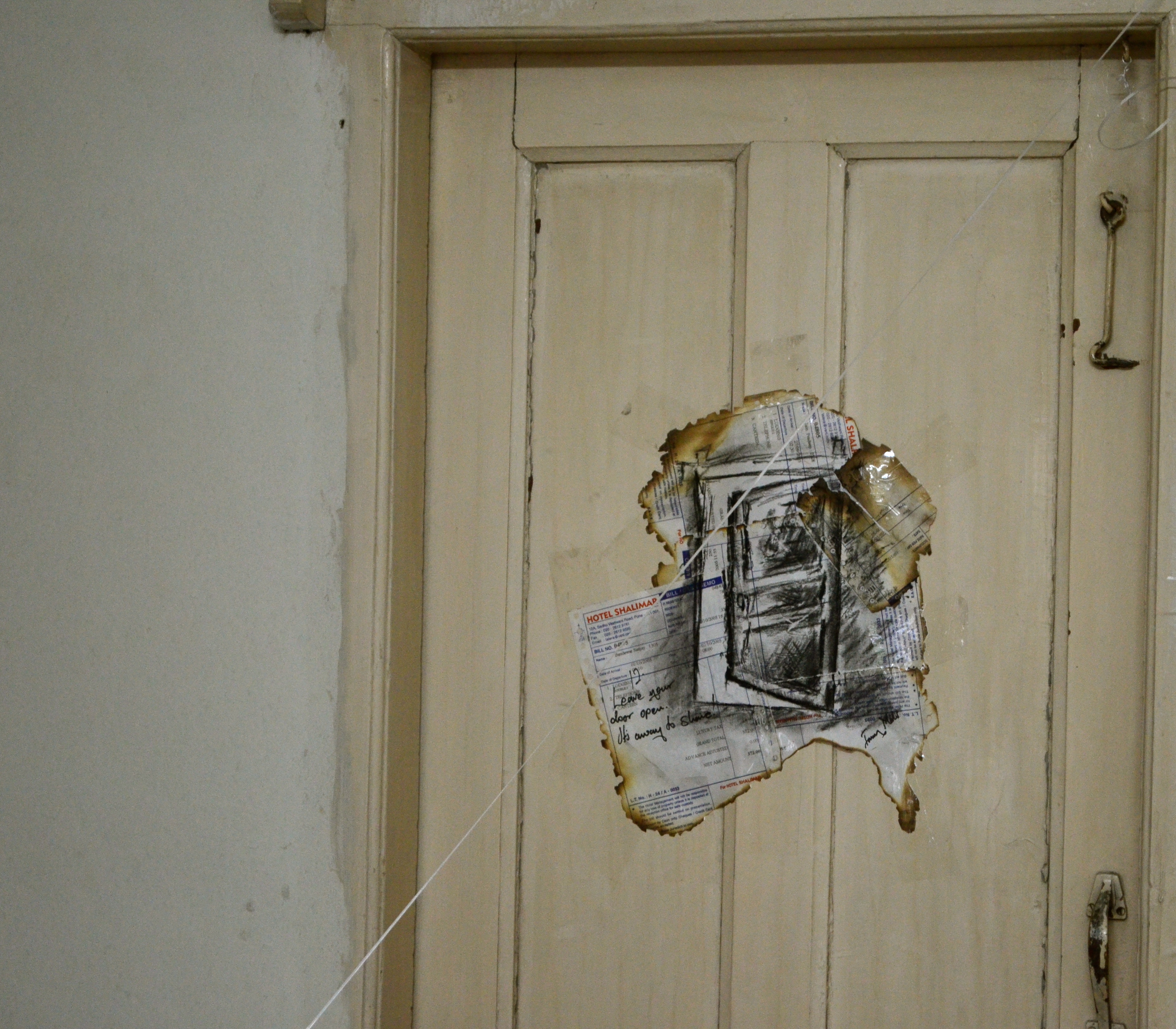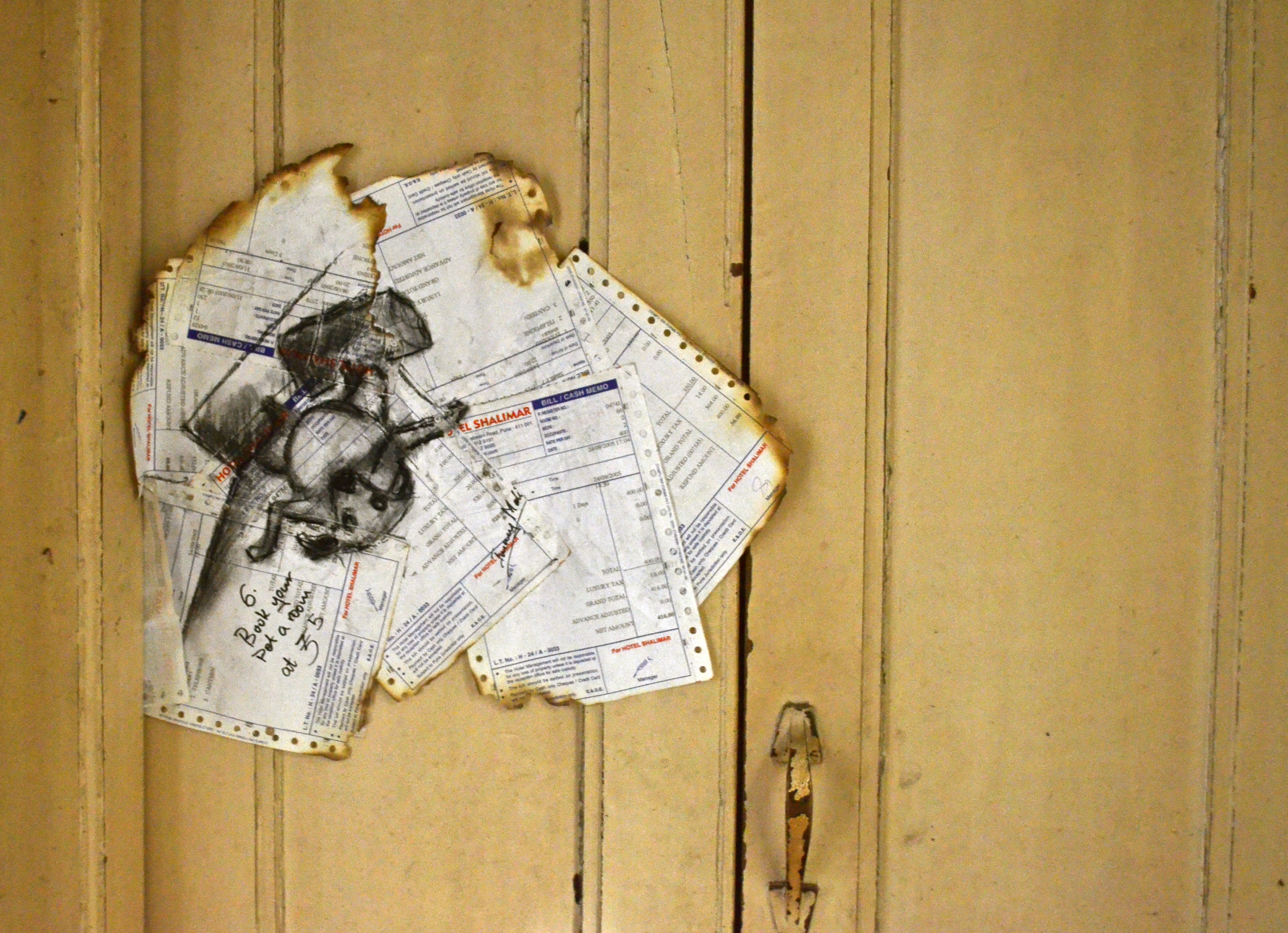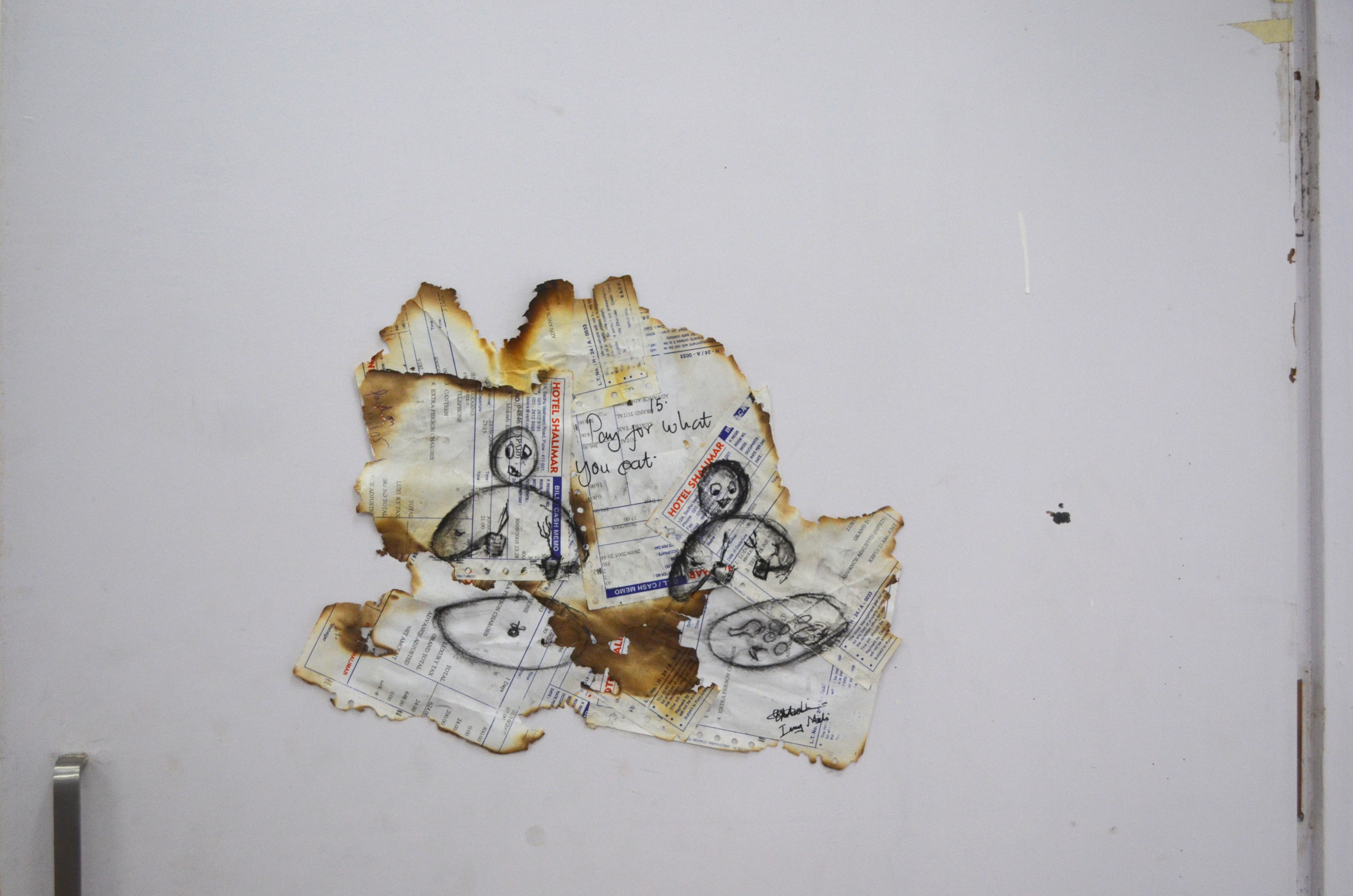 A paper wall is built of partially burnt hotel cash receipts that once belonged to